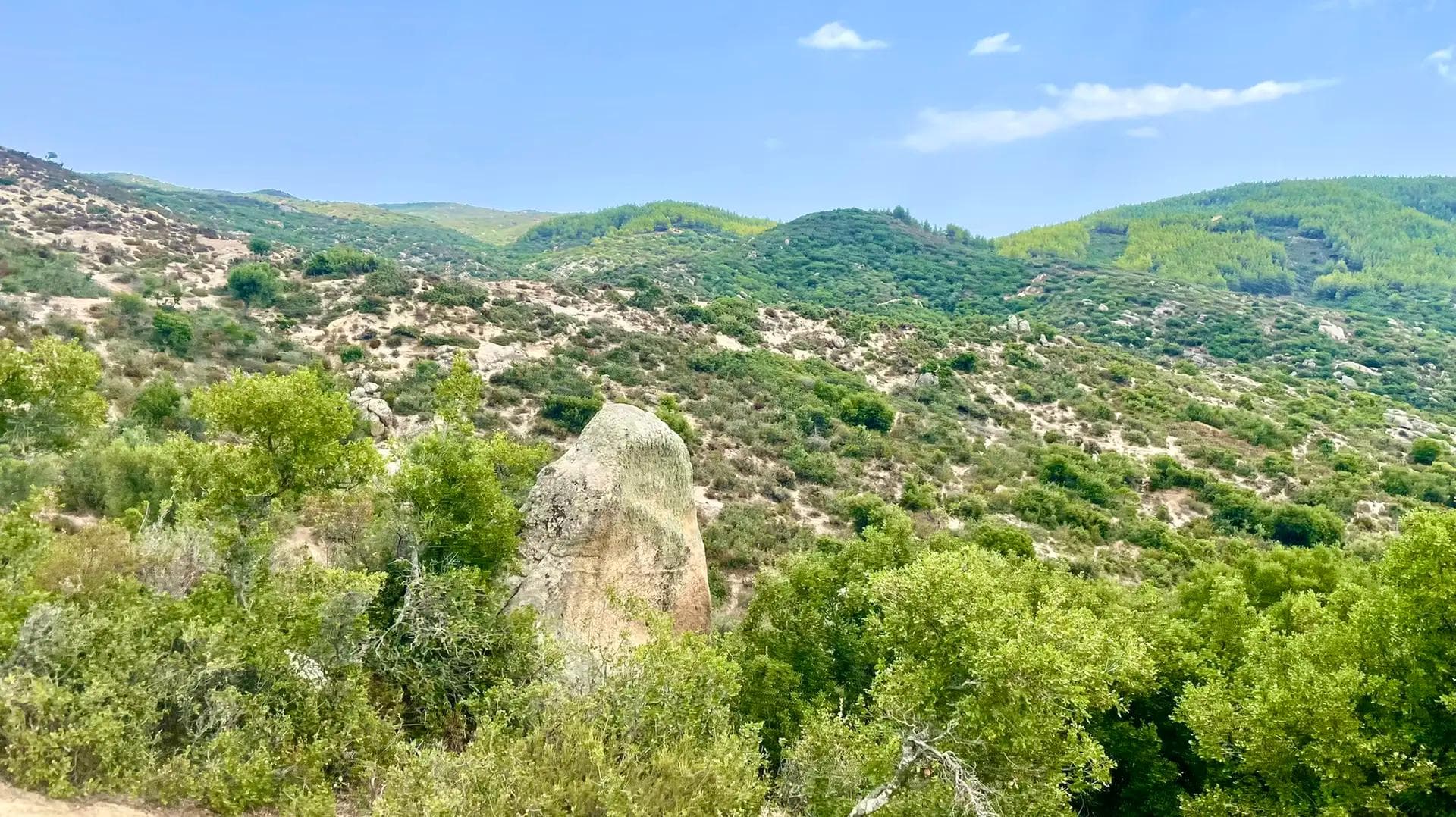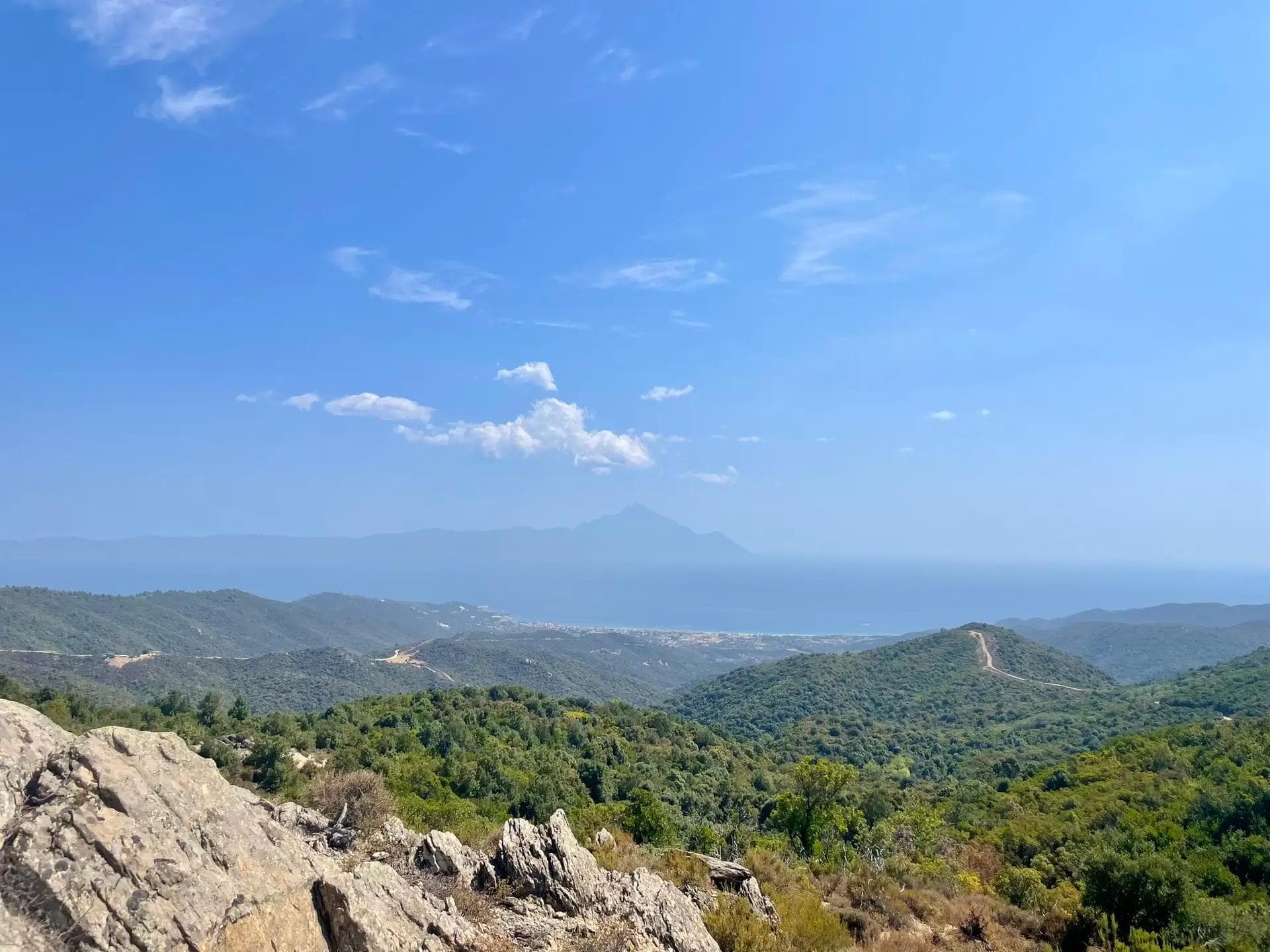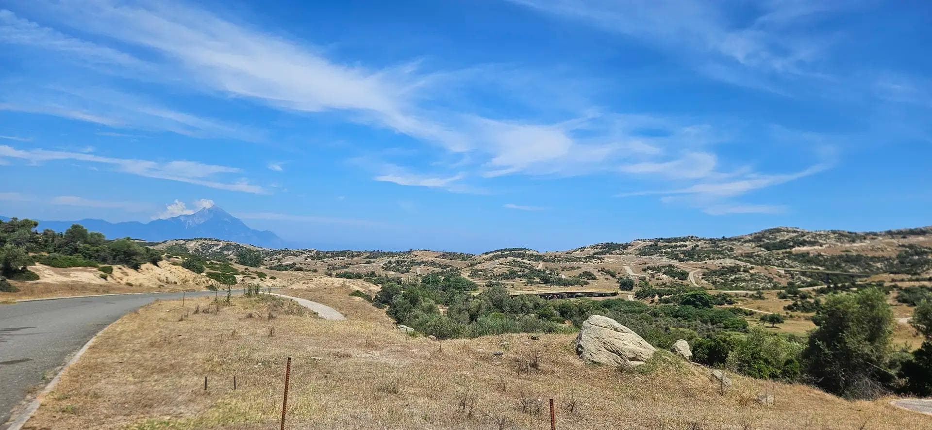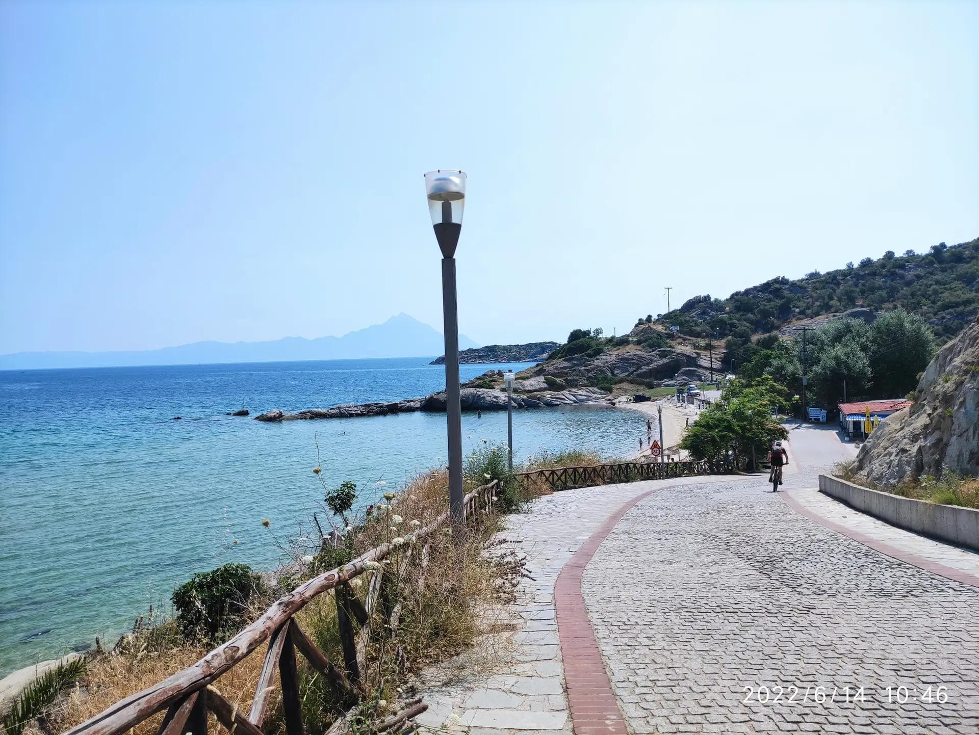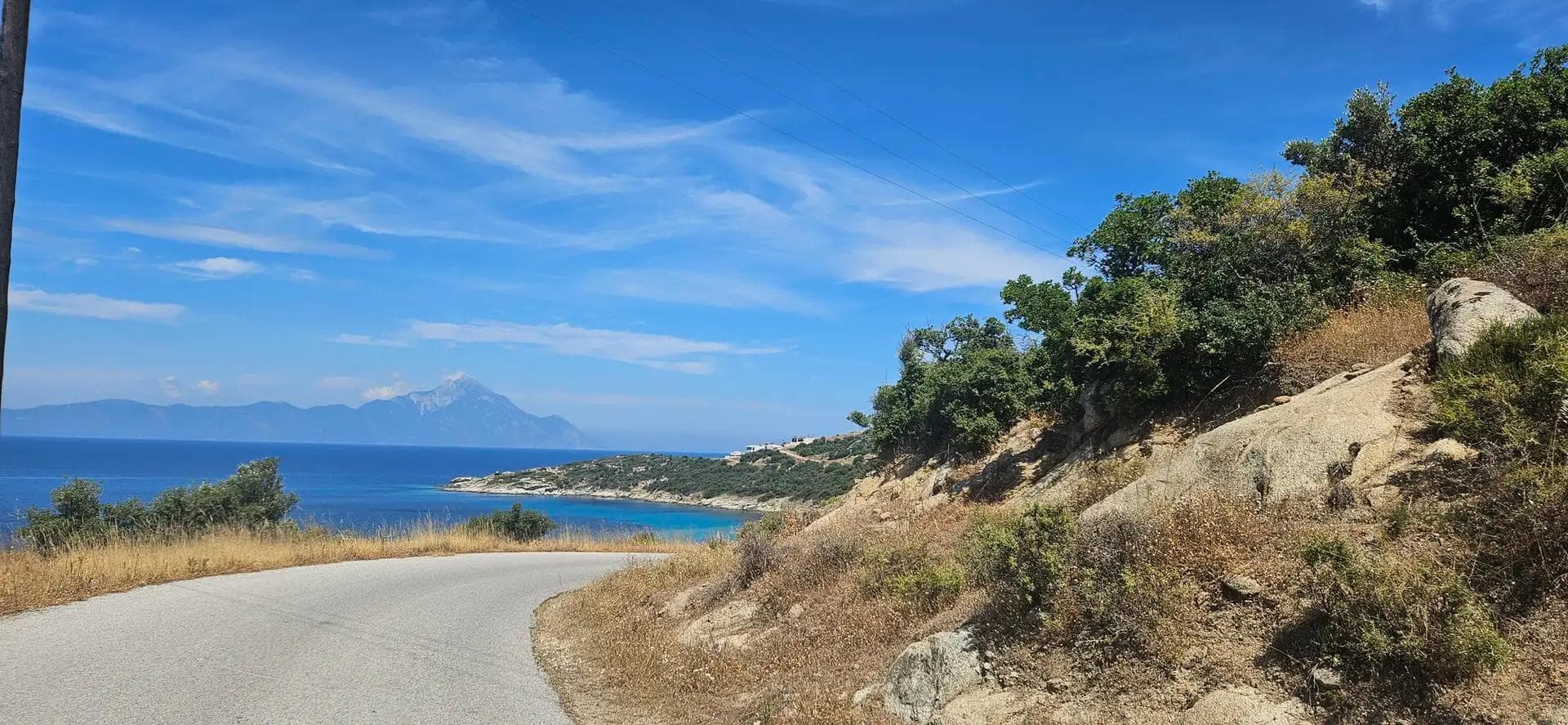 Маршрутът преминава през планинската част на полуострова и предлага красиви панорами към Егейско море.